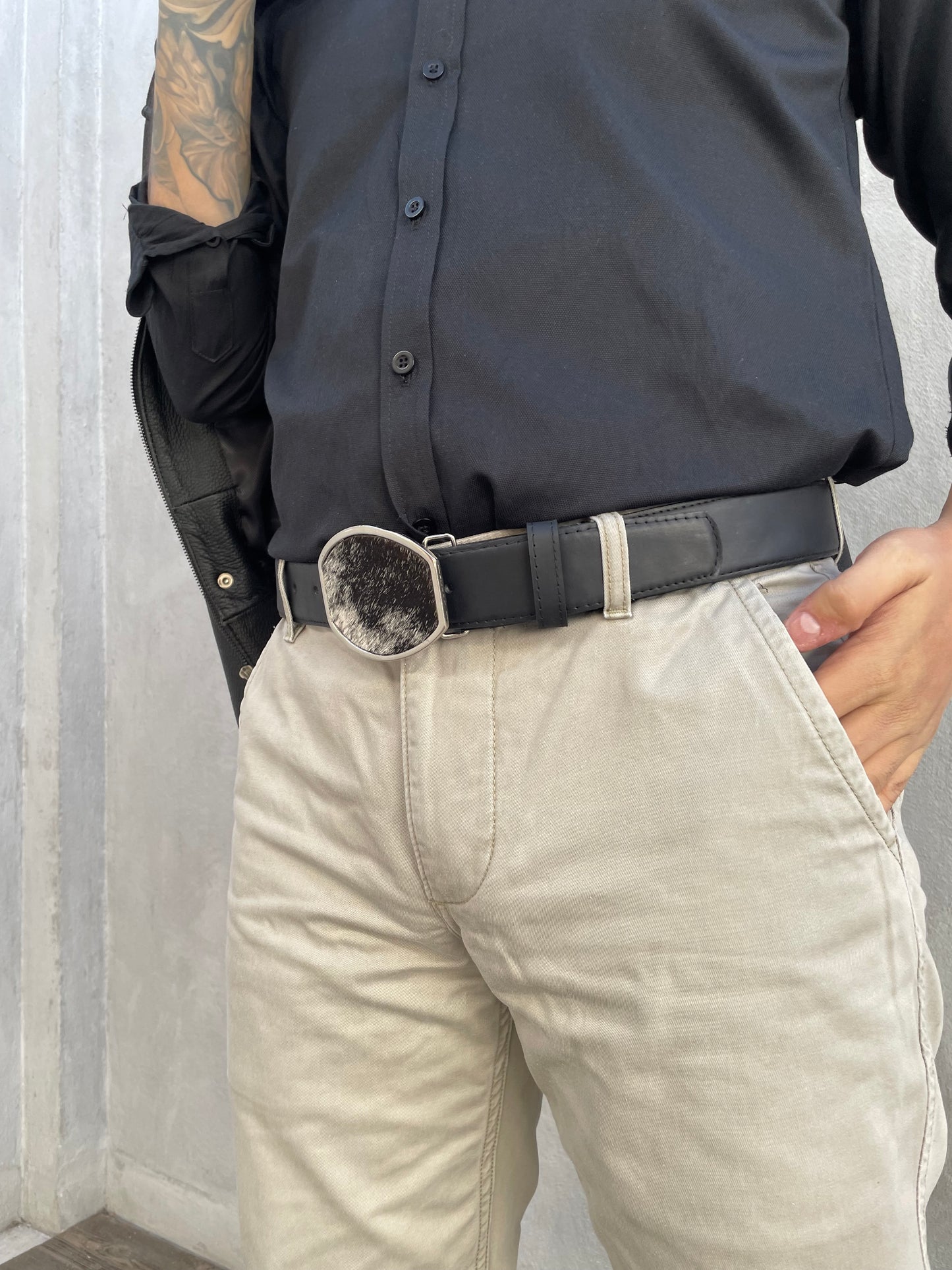 Cinto en piel de res con hebilla de metal y pelo de vaca
